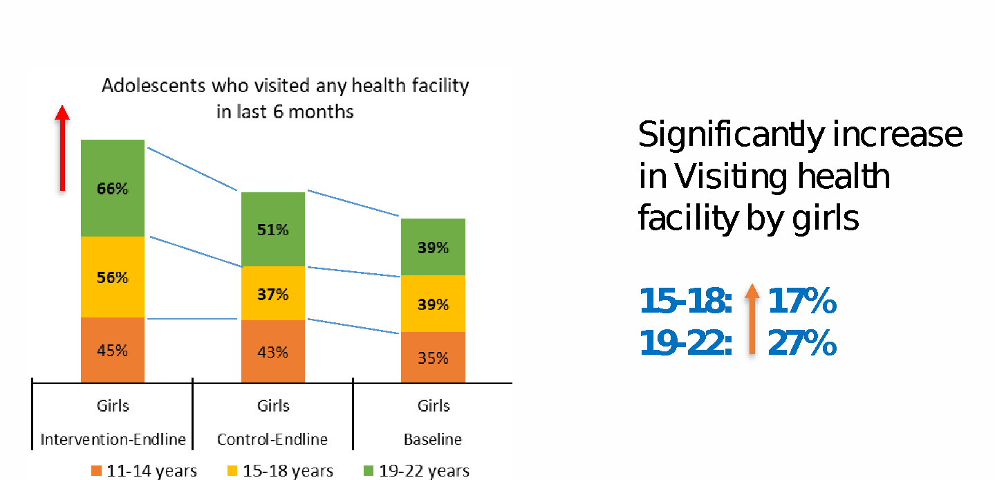 We found that after our intervention, adolescent girls visiting a health facility increased by 17% and adolescents of all age groups said that health services had improved in their areas!