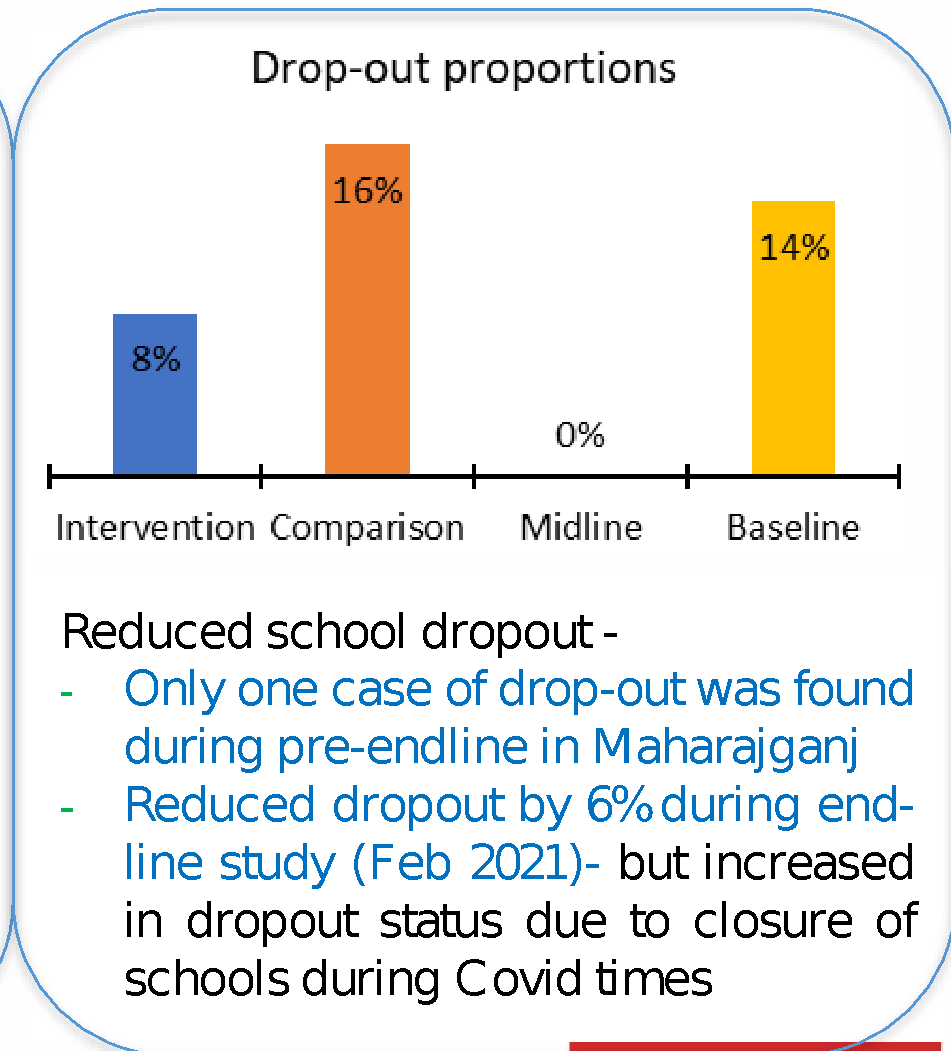 We found that after our intervention, adolescent drop out rates from school had decreased by 6% between baseline and endline, despite the impact of Covid-19.