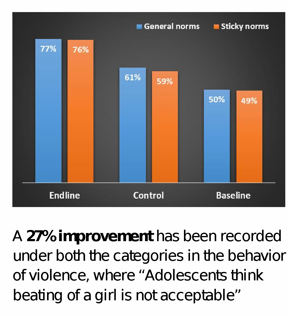 We also found that while only 18% adolescents disagreed with the statement that “Girls must do household chores because she needs to learn how to before going to live with her in-laws”, this figure improved to 28% during the endline stage in our areas of intervention.