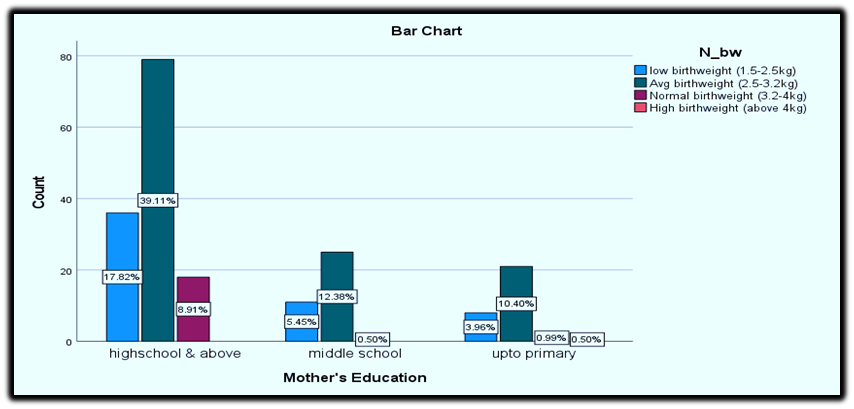 A positive trend between the educational status of the mother and the birth weight of the child is indicated. For mothers with high school and above educational qualifications, the percentage of children with average and normal birth weight (39.1% and 8.9% respectively) is highest than those having middle school and primary level qualifications.