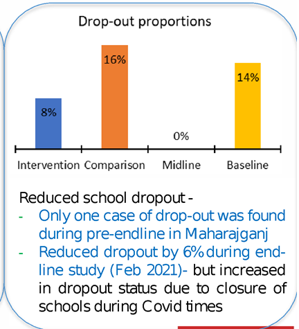 We found that after our intervention, adolescent drop out rates from school had decreased by 6% between baseline and endline, despite the impact of Covid-19.