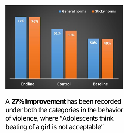 We also found that while only 18% adolescents disagreed with the statement that “Girls must do household chores because she needs to learn how to before going to live with her in-laws”, this figure improved to 28% during the endline stage in our areas of intervention.